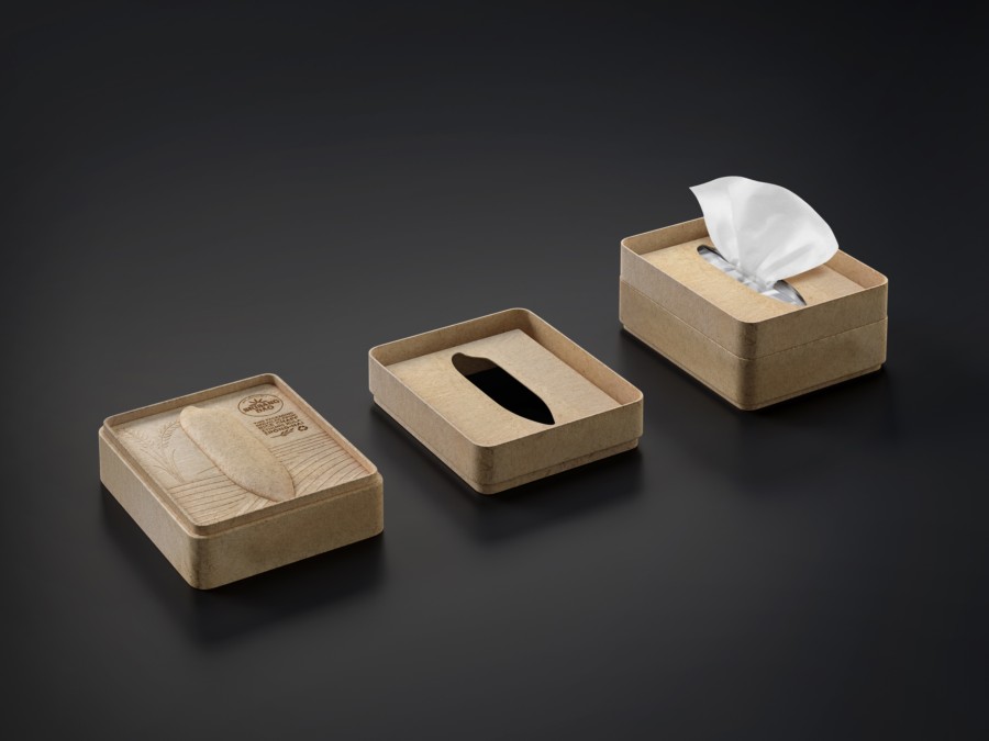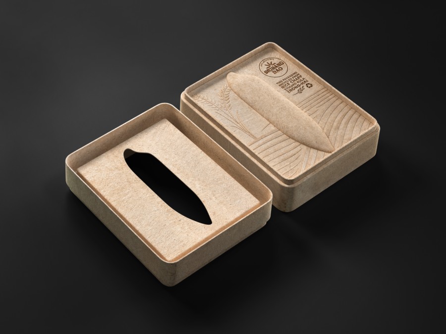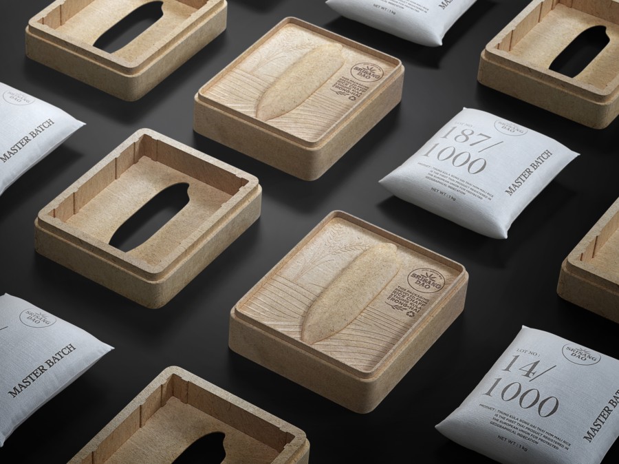 Thung Kula Ronghai是泰國著名的稻米產區,其優質的稻米生產享譽世界。在受控的環境中,每年的大米產量有限。因此,這種有機大米保證了最好的質量和不含化學物質。大米包裝設計面臨的挑戰是如何體現有機水稻的生長過程。Prompt Design設計的包裝袋使用的是來自于稻米去殼過程的廢棄物——糠皮。包裝模壓成型,盒蓋頂部為稻形壓花,盒子里裝著米袋。此外,這個大米包裝盒使用后可以用作紙巾盒。真正體現了環保的初衷。